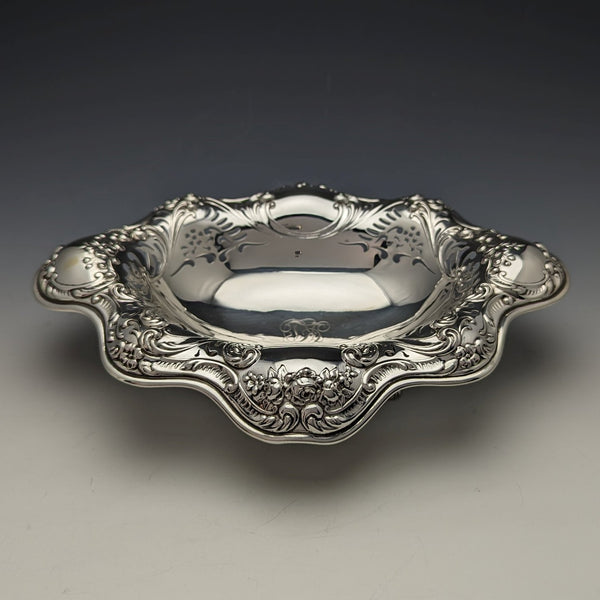 Introducing an American antique sterling silver dish. This is a piece made by Gorham, one of America's leading silversmiths. The three-dimensional carvings typical of American silver are very beautiful. It has four legs, and the legs are also decorated with...