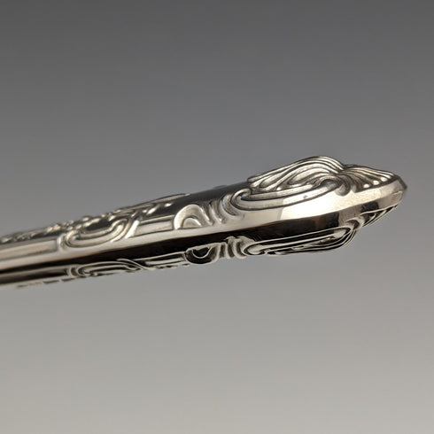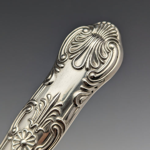 The sterling silver handle features a traditional Queens pattern.