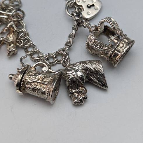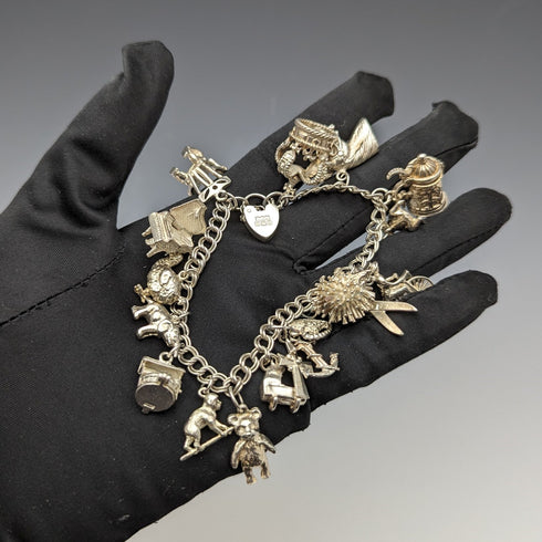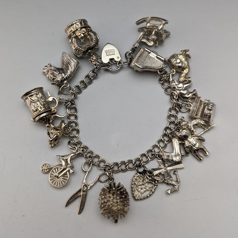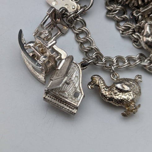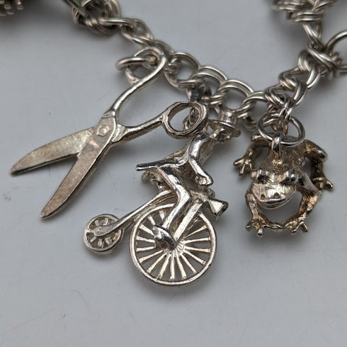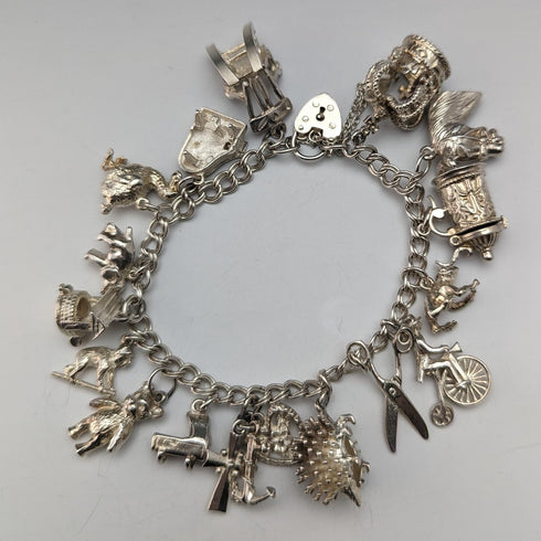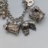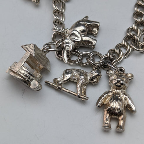 A bracelet with about 18 various silver charms, mainly animals, attached to a chain.
