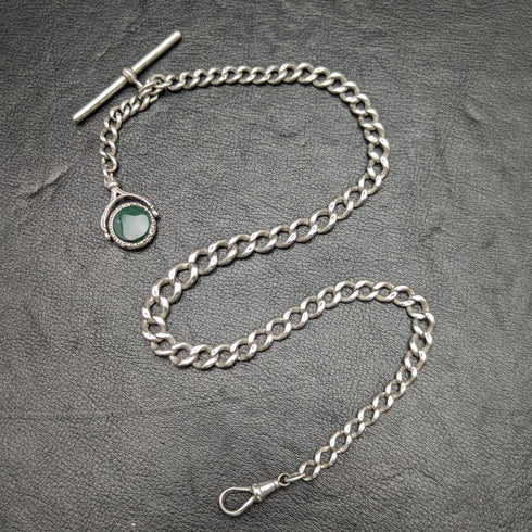 1900年頃 英国アンティーク 純銀アルバートチェーン 41g 2色天然石回転フォブ