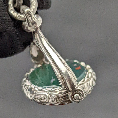 緑に少し赤の入ったブラッド・ストーンと赤いカーネリアンの回転式のフォブがついています。