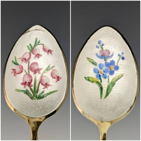 1958年 英国ヴィンテージ 純銀製 金メッキ&エナメル花装飾 ティースプーン6本セット ケース入
