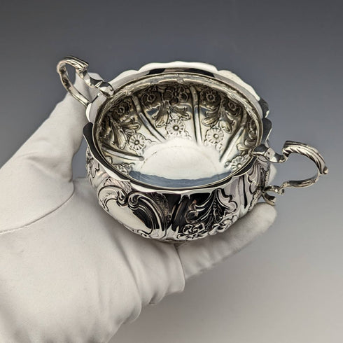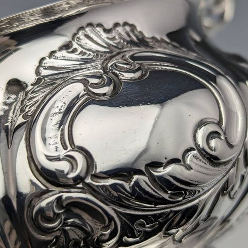 花とスクロールによる浮彫彫刻で装飾された美しいシュガーボウルです。