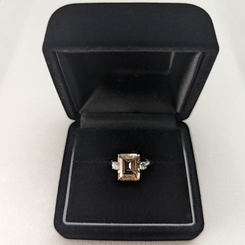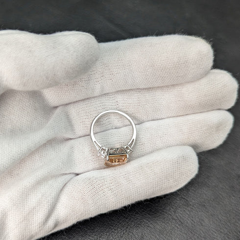 中央部分に大きなスクエア型のオレンジがかった薄いピンクの石、左右に一つずつ小さめの透明の丸粒石が、交差する曲線ラインの入った立て爪の台座に固定されたデザインです。