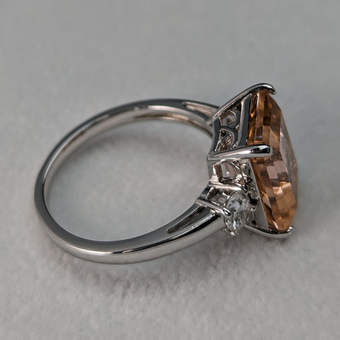 スターリングシルバー製のリングにピーチピンク色1石と透明2粒のジルコニアが付いたリングです。