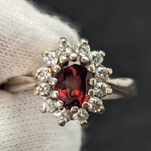 中心に美しくカットされた楕円のレッドの石、周りに透明の小さな石が12個セットされています。