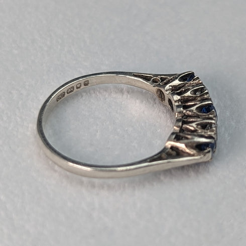 スターリングシルバー製のリングにブルー3石とホワイト2石が交互に並ぶ指輪です。