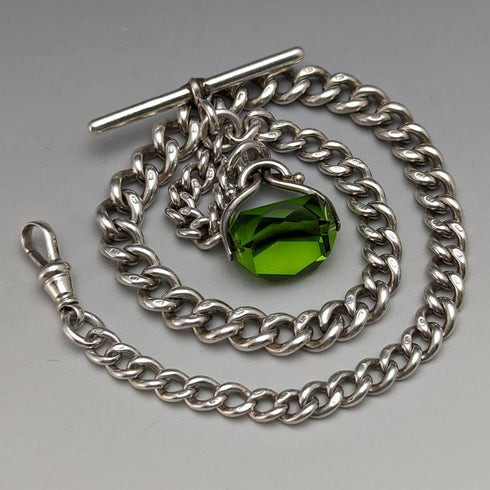 1920年頃 英国アンティーク 純銀製アルバートチェーン 46g グリーンストーン回転フォブ