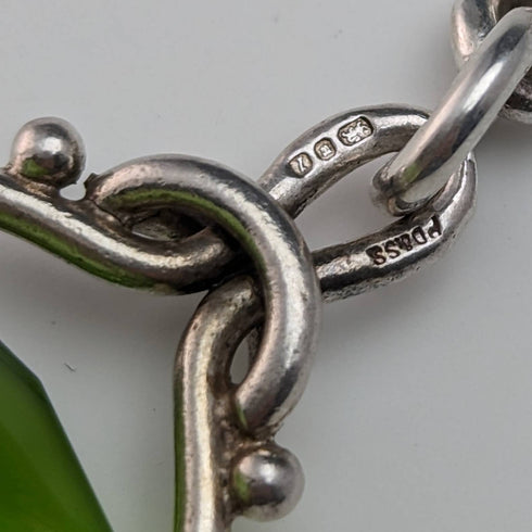 凝った作りの純銀の土台に美しく回転するグリーンストーンのフォブがついています。
