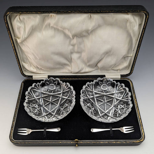1927年 英国ヴィンテージ カットグラス ディッシュペア 純銀フォークセット CW Fletcher & Sons 箱入り