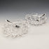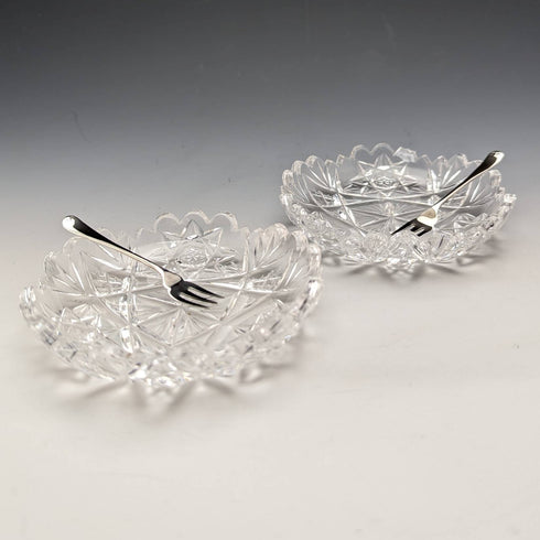 美しい手彫りのカットガラス製のボウルと純銀のフォークのペアとなっています。