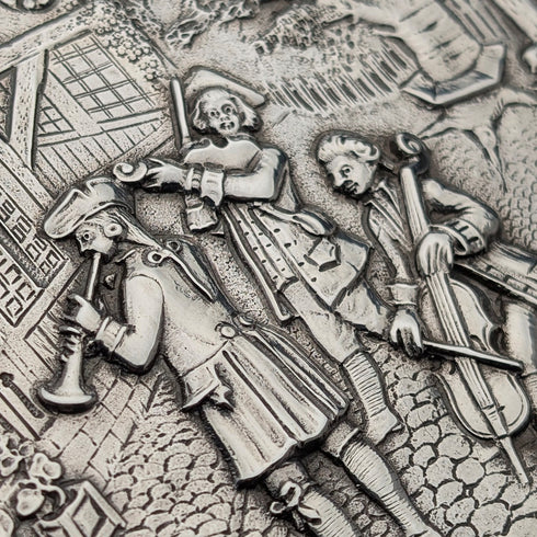 蓋と側面には音楽家と町並み、農作業する子どもたちをモチーフにした素朴な感じの浮彫装飾がほどこされています。