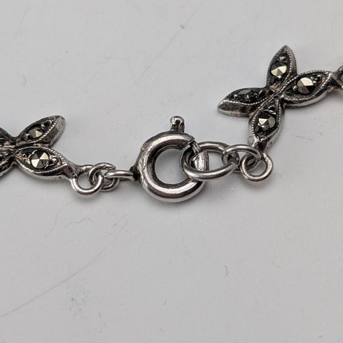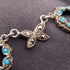ターコイズカラーの小さなガラスが埋め込まれたリング型のパーツと、マーカサイトが埋め込まれた蝶型のパーツが組み合わされた、美しいデザインとなっています。