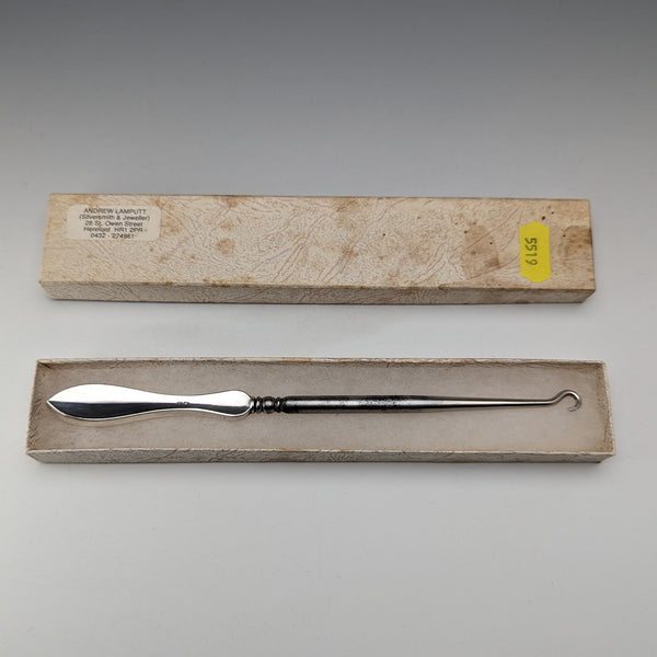 介紹古董紐扣掛鉤。紐扣掛鉤是一種即使戴著手套也能更輕鬆地固定羈扣的工具。 這是來自英國伯明罕的 William Vale 的作品,1911 年。對於紐扣鉤來說,它相當大,全長約21厘米,被認為是用於固定靴子紐扣的靴鉤。純銀手柄採用簡約的裝飾藝術風格設計。隨附一個來自零售商的紙盒。我們希望這個「一生一次的機會」對您來說將是一次特別的邂逅! 【健康)狀況】外觀:★★★★☆ 狀況良好,無明顯刮痕或污漬 功能:★★★★☆ 有輕微劣化,但幾乎沒有問題。・隨著時間的推移,會有一些磨損,但狀態良好,沒有明顯的刮痕或凹痕。 ・手柄上有英國化驗證書的標記,表明它是由純銀製成的。・掛鉤部分為鐵製,但沒有生鏽。・附有零售商提供的紙盒*這是一件非常舊的商品,因此由於年代久遠,有一些輕微的刮痕和污垢。購買前請檢查照片並確保您了解。 【細節】・製造商威廉維爾・製造年份:1911(伯明罕 M)・手柄材質:純銀 (925/1000)掛鉤:鋼・全長214mm ・重量 60g *由於這是古董物品,因此沒有其他物品完全相同。如果您有任何疑問,請隨時提問。