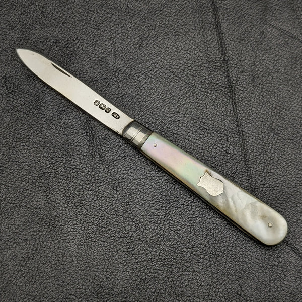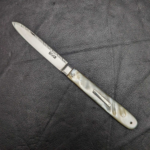 介紹英國古董折疊水果刀。比鋼筆刀稍大的水果刀。刀片由不銹鋼製成,可防止其被果酸生鏽。 這是一款帶有珍珠母手柄的折疊型。一把漂亮的刀,白色珍珠貝柄上有精美的雕刻。我們希望這把可愛的折疊刀能點亮您的一天! 【健康)狀況】外觀:★★★★☆ 漂亮的產品,沒有明顯的划痕或污漬 功能:★★★★☆ 有輕微劣化,但幾乎沒有問題・整體上有磨損和小划痕,但作為古董品保養得很好。・刀刃上有“WALKER&HALL”和“STAINLESS”印記。 ・刀片可以順暢地放入和取出。・刀刃磨得很好,仍然可以牢固地使用。 * 因為它很舊,所以有細小的划痕和老化造成的污垢。請檢查照片並確保您在購買前了解它們。 【細節】・廠商WALKER&HALL・1900年左右製造・材質手柄:白珍珠貝、鋼刀片:不銹鋼・尺寸全長158mm刀片長度 64mm・重量 34g *由於它是古董物品,因此沒有其他完全相同的物品。如果您有任何問題,請隨時提出任何問題。