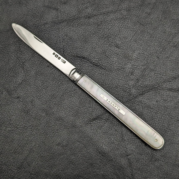 介紹英國古董折疊小刀。鉛筆刀是用來削尖羽毛筆尖的小刀。這是一個稍大的類型。它是可折疊的,帶有白色珍珠母手柄和純銀刀片。手柄採用流線型造型,圓潤造型,手感極佳。我們希望這把可愛的折疊刀能點亮您的一天! [條件等]・整體上有磨損和小划痕,但作為古董品保養得很好。 ・刀片上有英國鑑定實驗室保證純銀的標誌。・刀片可以順暢地放入和取出。・刀刃磨得很好。 * 因為它很舊,所以有細小的划痕和老化造成的污垢。請檢查照片並確保您在購買前了解它們。 【細節】・製造商:Harrison Fisher and Co.・製造年份 1926 (Sheffield i)・材料手柄:珍珠母,鋼刃:純銀 (925/1000)・尺寸全長158mm刀片長度 65mm・重量 38g * 由於是古董物品,沒有其他完全相同的物品。如果您有任何疑問,請隨時向我們詢問。