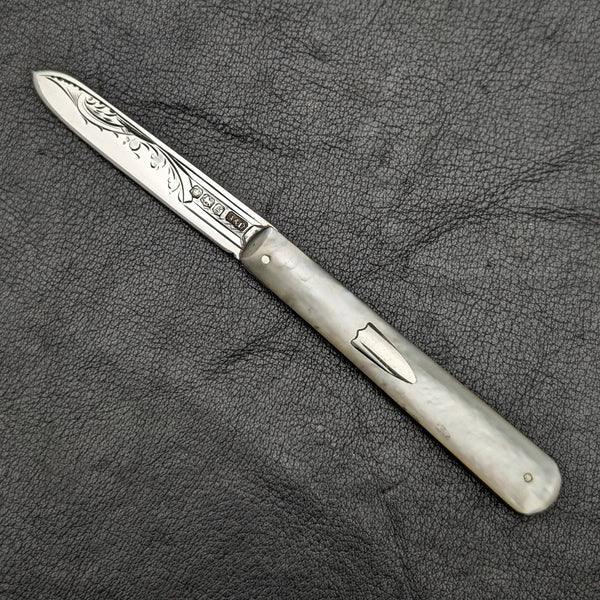 介紹英國古董折疊小刀。鉛筆刀是用來削尖羽毛筆尖的小刀。似乎您也可以削鉛筆並將其用作開信刀。這是一種折疊型,純銀刀片附在珍珠母貝手柄上。一把漂亮的刀,在珍珠母手柄和純銀刀片上都有復雜的雕刻。不僅是雕塑,整個造型都經過精心設計。我們希望這把可愛的折疊刀能點亮您的一天! 【健康)狀況】外觀:★★★★☆ 漂亮的產品,沒有明顯的划痕或污漬 功能:★★★★☆ 有輕微劣化,但幾乎沒有問題・整體上有磨損和小划痕,但作為古董品保養得很好。・刀片上有英國鑑定實驗室保證純銀的標誌。・刀片可以順暢地放入和取出。・刀刃磨得很好,仍然可以牢固地使用。 * 因為它很舊,所以有細小的划痕和老化造成的污垢。 請檢查照片並確保您在購買前了解它們。 【細節】・製造商:James Deakin & Sons・製造年份 1910 (Sheffield s)・材質手柄:白珍珠貝、鋼刀片:純銀 (925/1000)・尺寸全長136mm刀片長度 57mm・重量 23g *由於它是古董物品,因此沒有其他完全相同的物品。如果您有任何問題,請隨時提出任何問題。