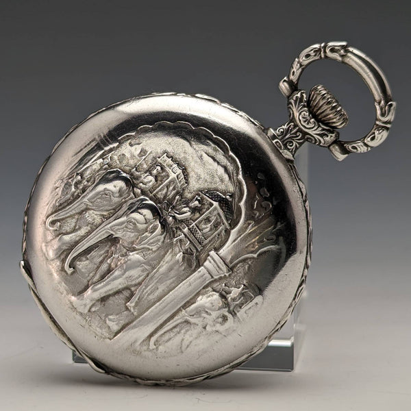 我們將為您介紹浪琴表的古董懷錶,這是一家成立於1832年、歷史悠久的老牌製造商。這是一款在銀色獵手錶殼的正反面都有不同圖案浮雕的懷錶。正面有大象籠,背面有精美的騎駱駝浮雕。這是一款非常漂亮的懷錶,側面和表冠周圍都有精美的雕刻。大修歷史未知,但擺輪擺動良好,滴答作響且運轉良好。我們希望這款可愛的古董手錶能為您的一天增添一些色彩! 【健康)狀況】外觀:★★★☆☆ 輕微划痕和髒污 功能:★★★★☆ 維護歷史未知,但工作狀態良好(每天少於 5 分鐘) (解釋視頻) https://youtu.be/lDBsNnwoCFM ・錶殼:雖然隨著時間的推移有所磨損,但狀態良好,沒有明顯的划痕或凹痕。推動表冠打開蓋子的機制很順暢,因為彈簧也起作用。・錶殼雕刻:後蓋和防塵蓋內側刻有瑞士900銀雕刻。・錶盤:4-5點鐘位置附近有小裂紋。・其他:擋風玻璃是亞克力材質,有點臟。・精度:使用平坦時間繪圖儀測量時,每天誤差在 1 分鐘以內・動力儲存:確認從滿發條至 36 小時*每日差異會根據姿勢差異和發條上弦情況而變化,因此請作為參考。 * 由於很舊,不知道零件更換和維修的歷史【細節】・品牌 浪琴表・1909年左右製造・機械機芯(Cal.18.80)・主發條手動上鍊・時間調整劍拉(槓桿組)・序列號2303155・外殼材質硬幣銀 (900/1000)・錶殼直徑 49 毫米(不含表冠)・錶殼厚度13mm(包括擋風玻璃)・重量 91g *由於它是古董,因此沒有其他完全相同的物品。如果您有任何疑問,請隨時提問。