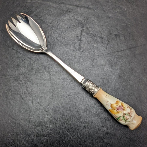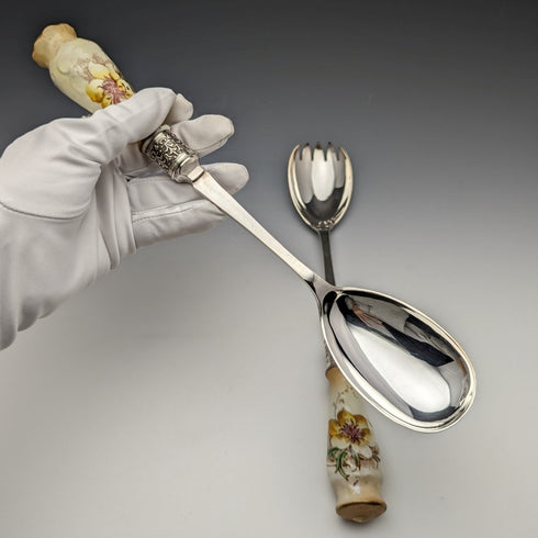 帶有不尋常的陶瓷手柄和銀盤碗的沙拉服務器套裝。