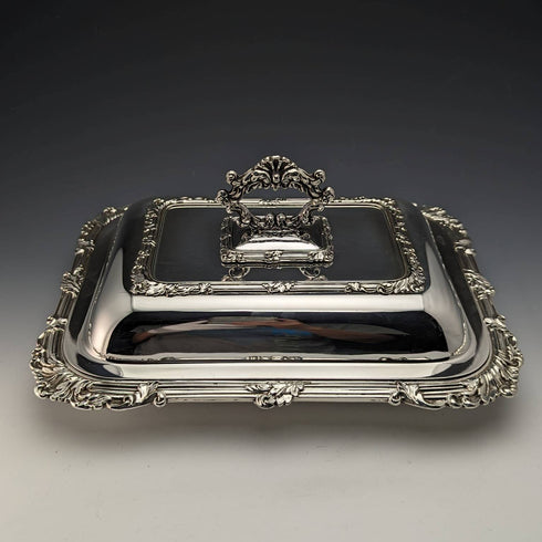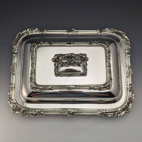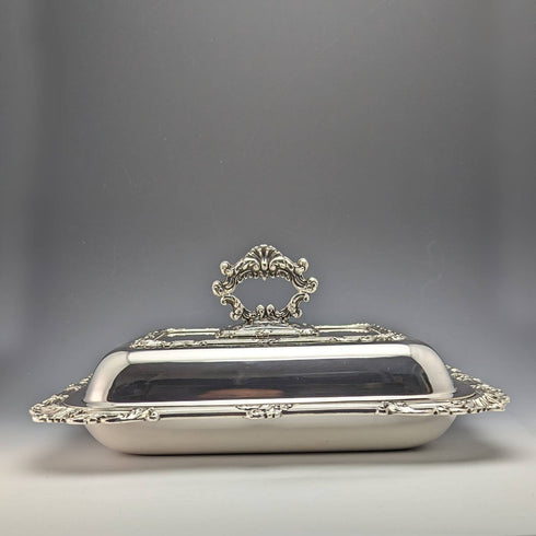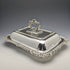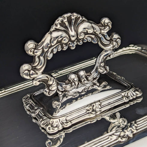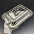 蓋子的把手和盤子的邊緣都裝飾著美麗的古董裝飾。