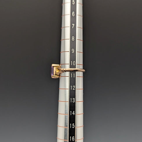 一枚由 9 克拉金製成的戒指,鑲嵌著一顆看起來像是紫水晶的大紫色寶石。