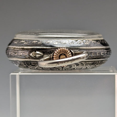 這是一款1886年左右製作的懷錶,銀色錶殼鑲嵌黑色合金材質。