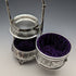桶狀機身,中間有兩個旋轉空間,可存放小物品,內部襯有紫色絲絨。