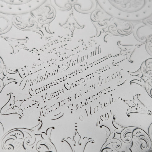 盤面飾有細緻雕刻裝飾,中央刻有1894年3月贈送的文字。