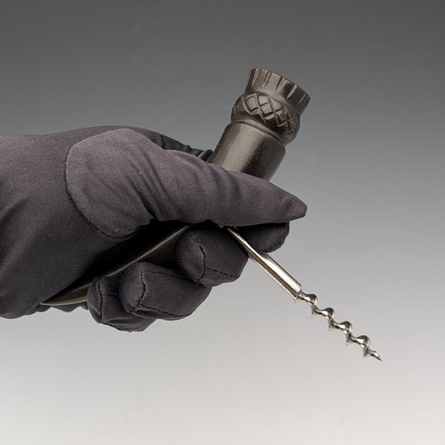 手柄由塗成黑色的硬木製成,並塑造成有棱角的形狀。手柄底部裝飾有薊花。
