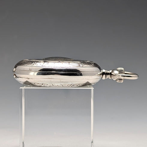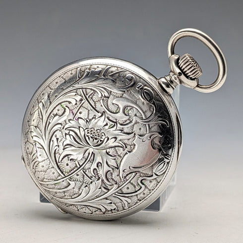 這是一塊約 1923 年產的銀殼懷錶。這是一款半獵人(demi-hunter)類型懷錶,即使蓋子關閉,您也可以查看時間。