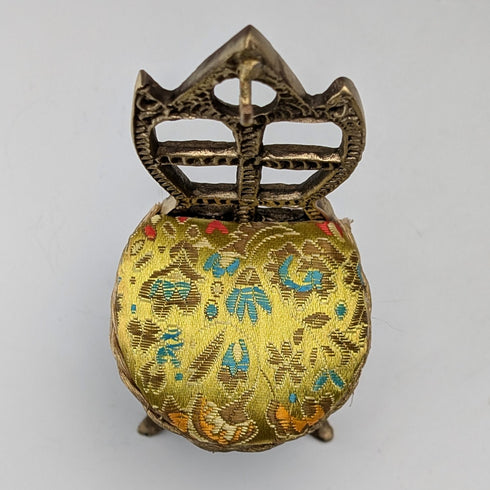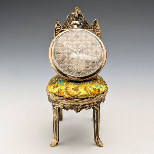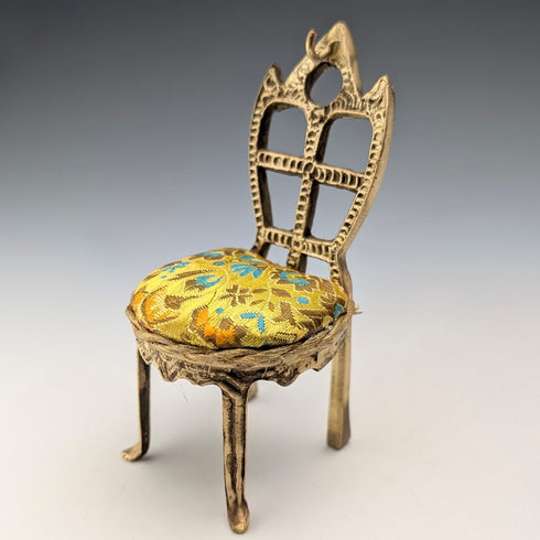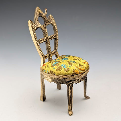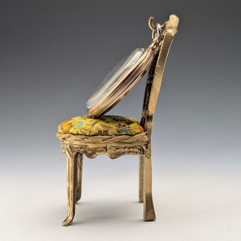20 世紀 20 年代古董黃銅椅形懷錶架,帶黃色刺繡座椅