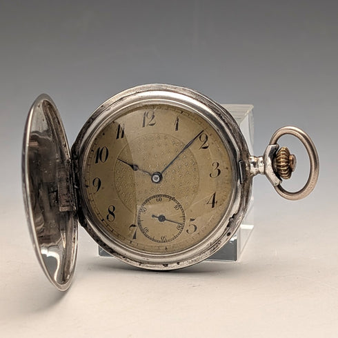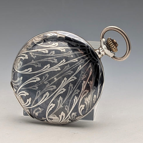 古董瑞士製造無簽名懷錶,銀色側面有黑金裝飾,纖薄獵錶殼,運作良好