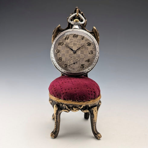 1920年代古董黃銅椅子懷錶架,搭配波爾多絲絨座椅