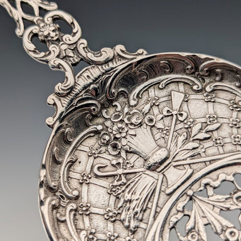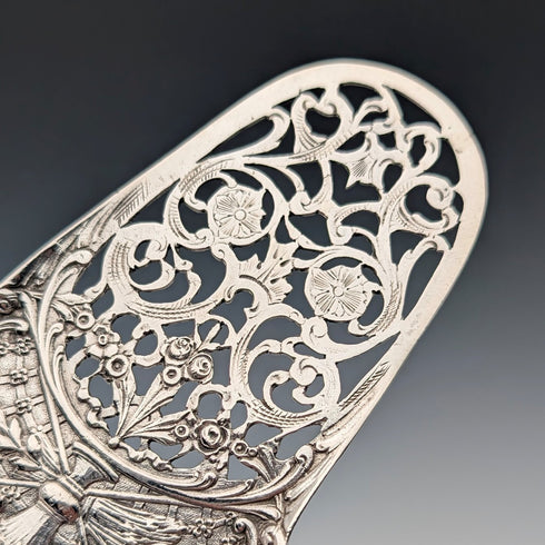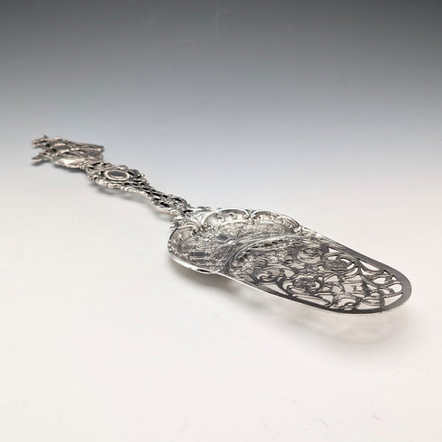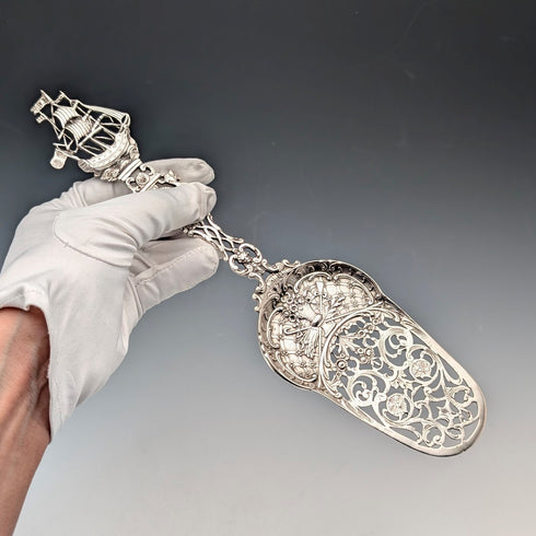 這款大型糕點鏟刀的刀刃上有精美的雕刻和鏤空裝飾,刀柄尖端則雕刻有精美的帆船圖案。