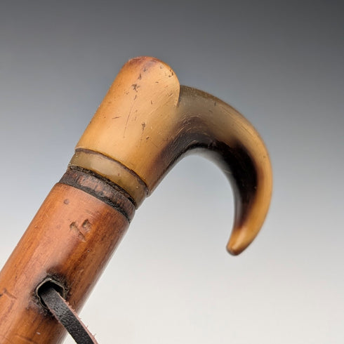 它有一個帶皮帶的小角柄和一根粗馬六甲藤桿。