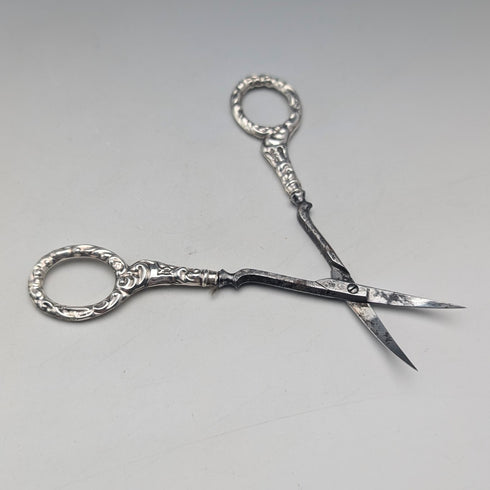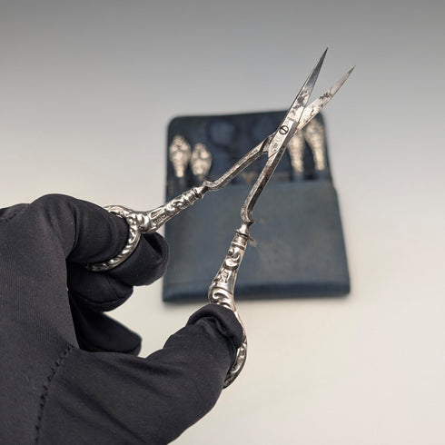 - 它們保養得很好,但有磨損和污垢的跡象。 - 純銀手柄上刻有英國標誌。 - 刀片由鋼製成,但沒有生鏽,可以毫無問題地使用。 - 剪刀手把移動順暢。 - 盒子有老化的跡象和一些撕裂,但仍然狀況良好。