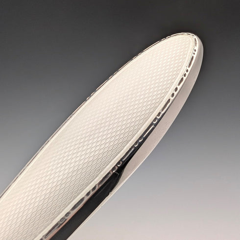 整件作品以白色扭索紋琺瑯裝飾,鏡子背面裝飾著一隻棲息在開花樹枝上的藍色虎皮鸚鵡。