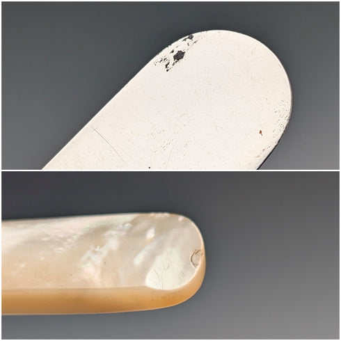白色珍珠母貝手柄呈圓形,刀片雖然沒有雕刻或其他裝飾,但手柄和刀片之間的安裝部分有裝飾。