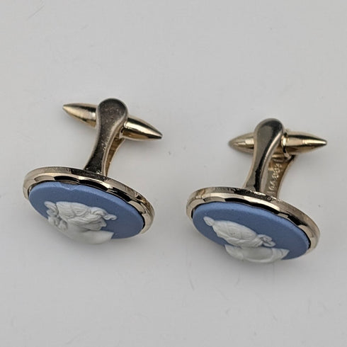 這些袖扣採用韋奇伍德藍色陶器製成,底座鍍金,飾有女神浮雕圖案。