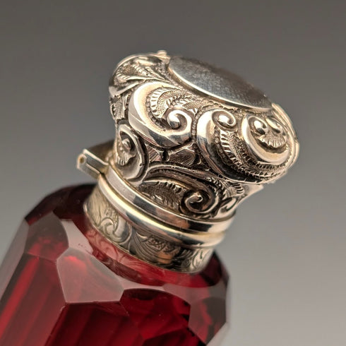 這是英國維多利亞時代左右,玻璃與純銀製蓋子的便攜式香水瓶。