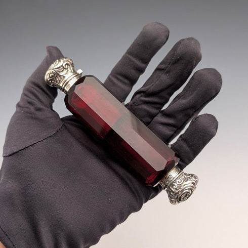 英國古董 800銀蓋 紅寶石紅玻璃 雙頭 攜帶用香水瓶