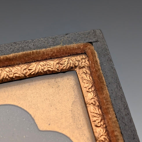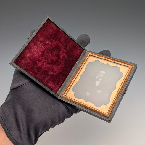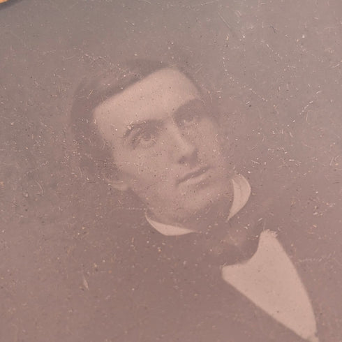 這是1850年代發明的「濕版玻璃照片」(Ambrotype),使用塗有藥劑的玻璃板拍攝的古老攝影技術,內含一位男性的照片。