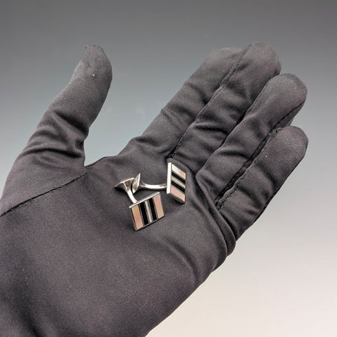復古 純銀製 白蝶貝&縞瑪瑙 條紋設計 袖扣 袖釦