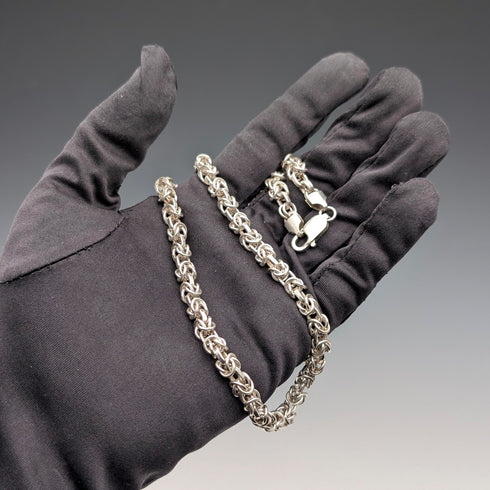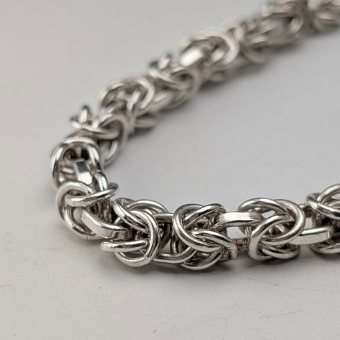 這是一條由稱為拜占庭鏈的圓環編織而成的複雜結構純銀鏈項鍊。