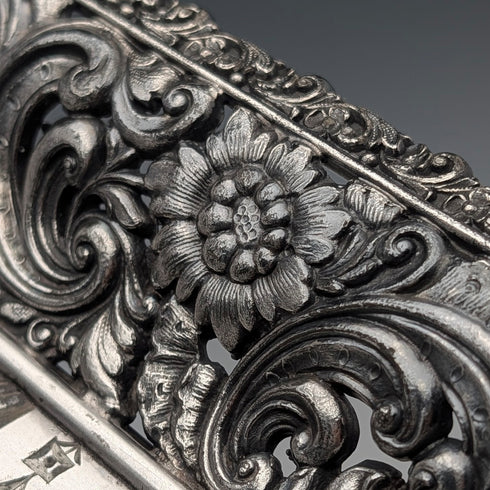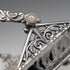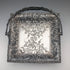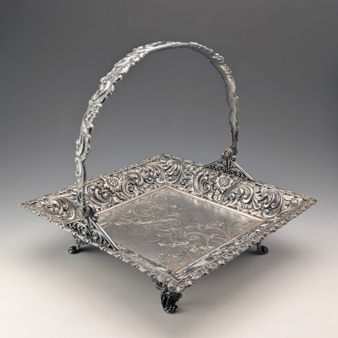 可動式のハンドルと4本の脚のついた角形のバスケットで、各所に美しい装飾がほどこされています。